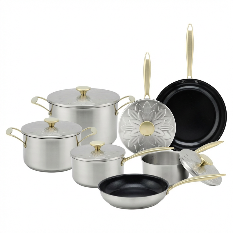 Factory New Arrival Stainless Steel Golden Handle Cookware Set Cooking Pots Impact Bonded Bottom Cookware Set Frypan Saucepan