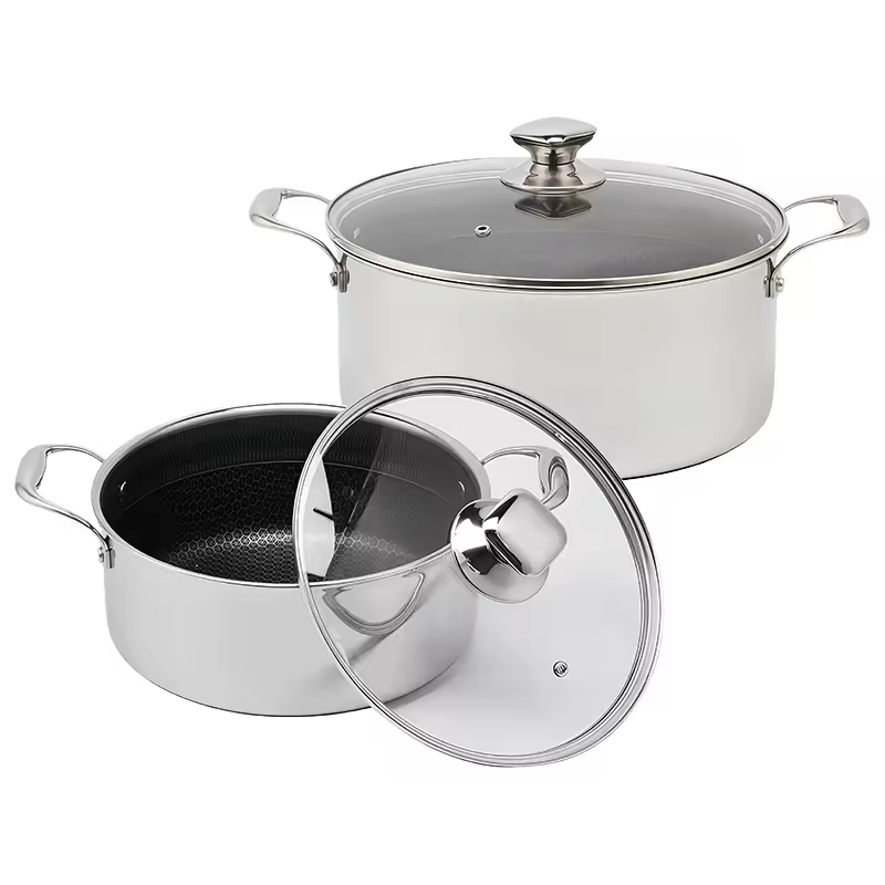 material | ①2.0mm(0.4mm SS304+1.0mm Alum+0.6mm SS430) ②2.3mm(0.4mm SS304+1.3mm Alum+0.6mm SS430) Handle: SS201 Hollow Cast Steel, Connected with rivet Lid: 4.0mm G Type Glass + SS201 Rim & Air Vent Lid Knob: SS201 Hollow Finish: Inside Honey Comb with Ceramic Non-Stick Coating, Outside Mirror |