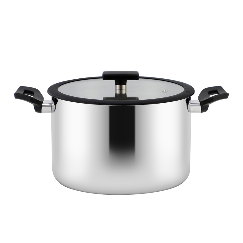 material | Body: SS201 or SS304, 0.5mm, Bottom:0.5mm alum+1.0mm iron+0.5mm alum,and 0.5mm SS430 for induction, Handle & Knob:SS201 Lid:4mm G type glass lid, Finish: satin finish inside and outside |