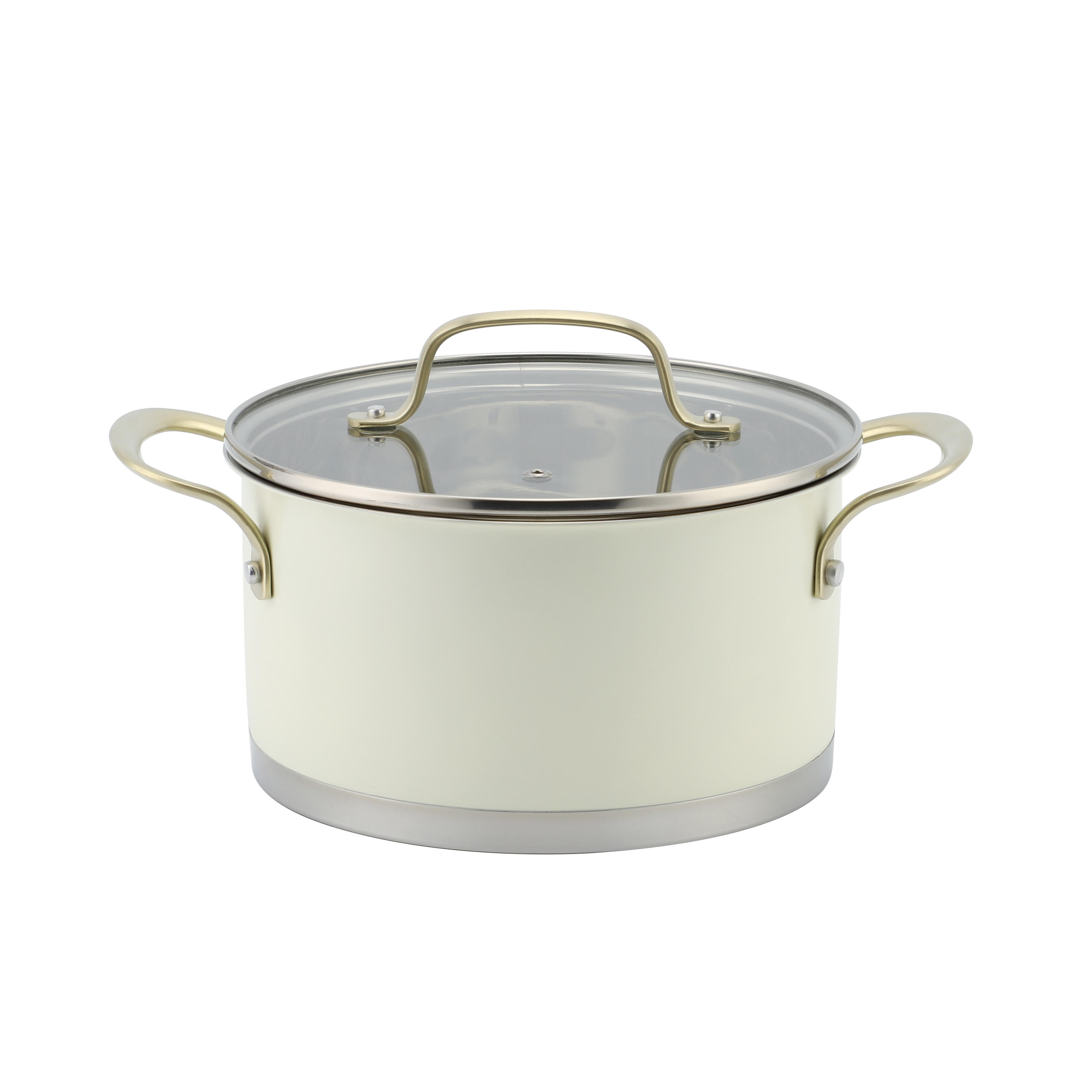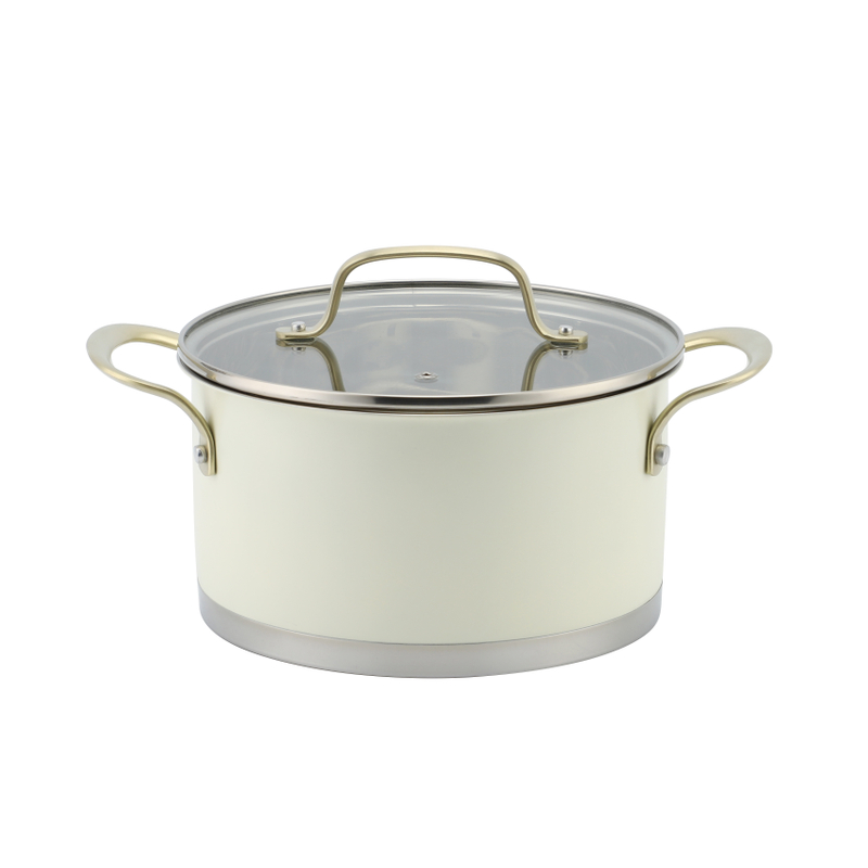 material | Body: SS201 , 0.45mm, Bottom:0.3mm alu.+2.0mm iron+0.3mm alu.,#430 for induction, Handle & Knob:SS201 handle Lid:4mm glass lid, Finish: satin finish inside and color paint outside |