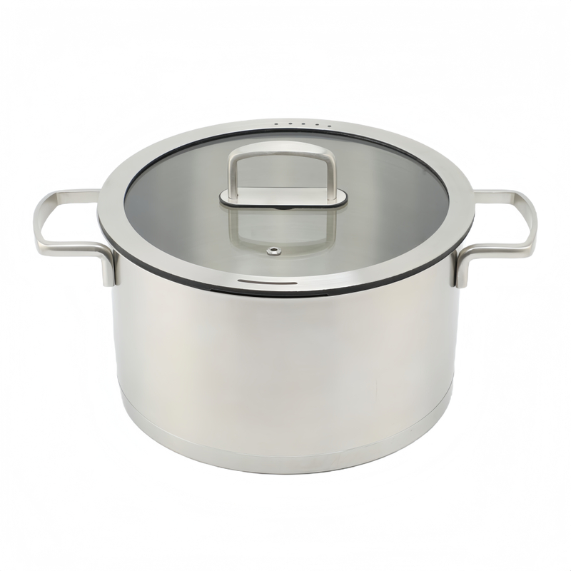 material | Body: SS304, 0.5mm, Bottom:0.5mm alum+1.0mm iron+0.5mm alum,and 0.5mm SS430 for induction, Handle & Knob:SS201 Lid:stainless steel lid, Finish: satin finish inside and outside |