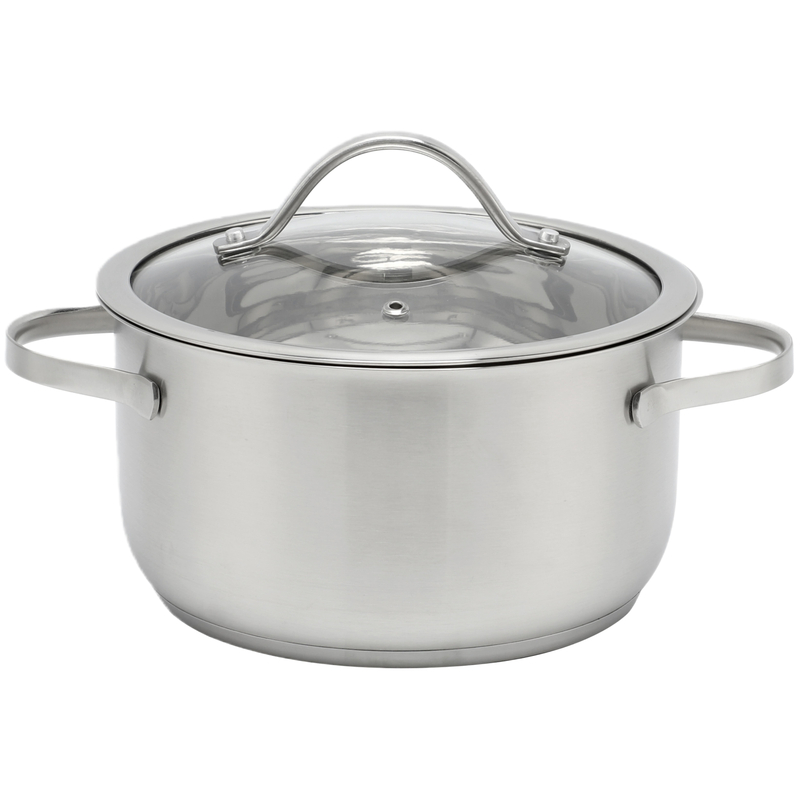 material | Body: SS201 , 0.45mm, Bottom:0.3mm alu.+2.0mm iron+0.3mm alu.,#430 for induction, Handle & Knob:SS201 hollow handle with silicone Lid:4mm G type glass lid, Finish: satin finish inside and outside |