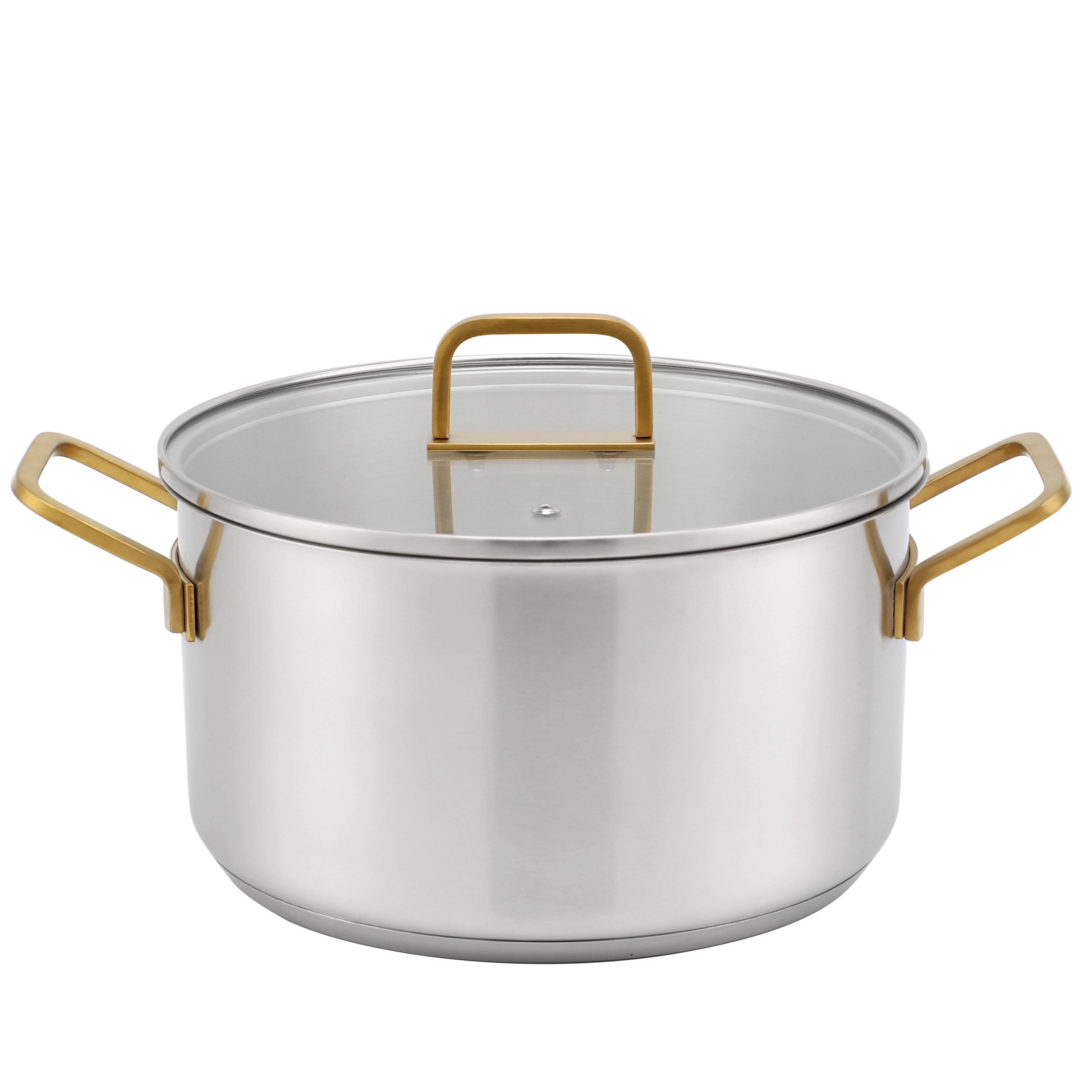 material | Body: SS201 or SS304, 0.5mm, Bottom:0.5mm alum+1.0mm iron+0.5mm alum,and 0.5mm SS430 for induction, Handle & Knob:SS201 Lid:4mm G type glass lid, Finish: satin finish inside and outside |