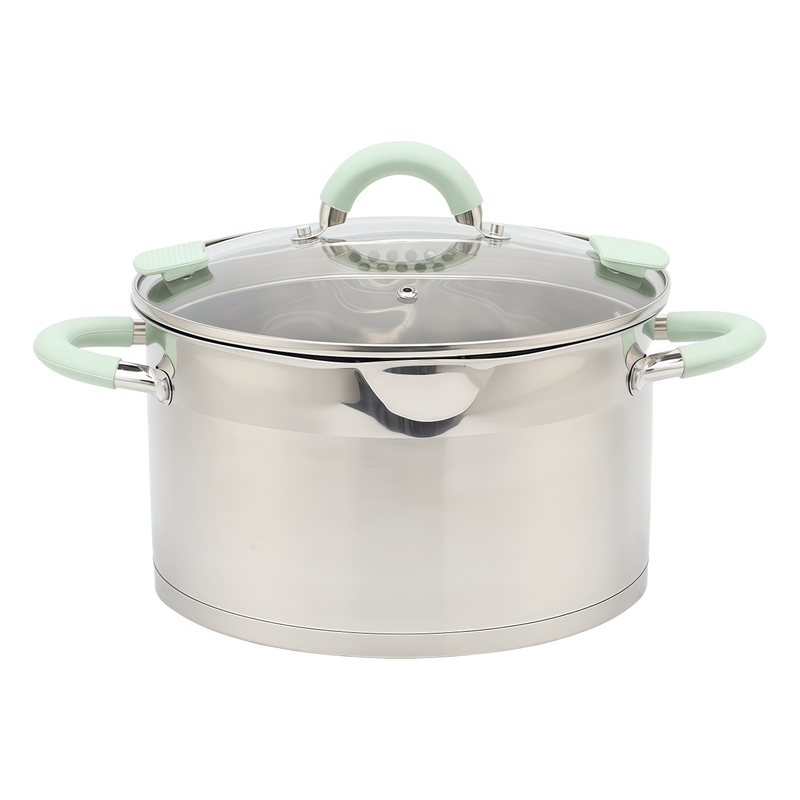 material | Body: SS201 , 0.45mm, Bottom:0.3mm alu.+2.0mm iron+0.3mm alu.,#430 for induction, Handle & Knob:SS201 hollow handle with silicone Lid:4mm G type glass lid, Finish: satin finish inside and outside |